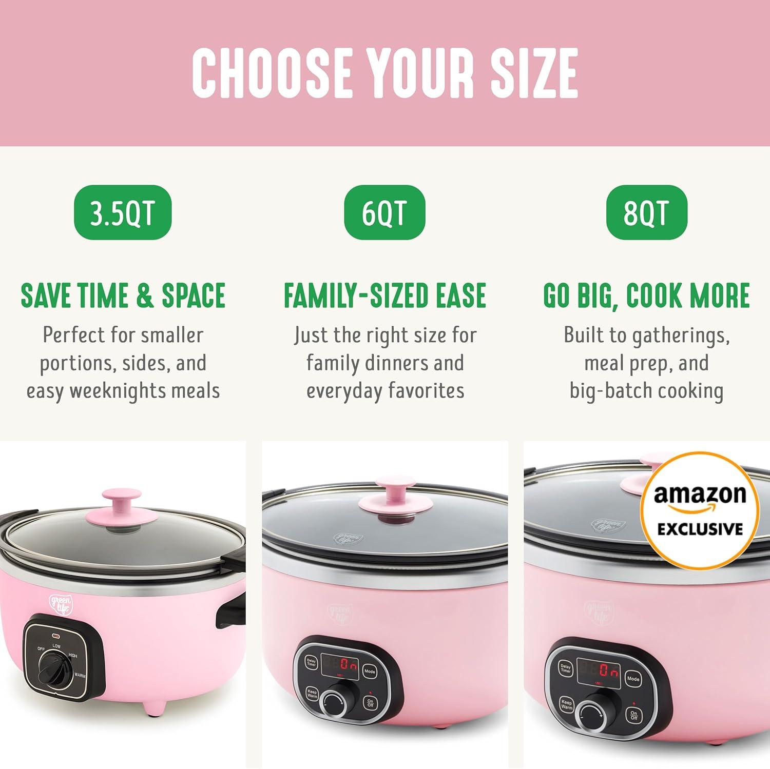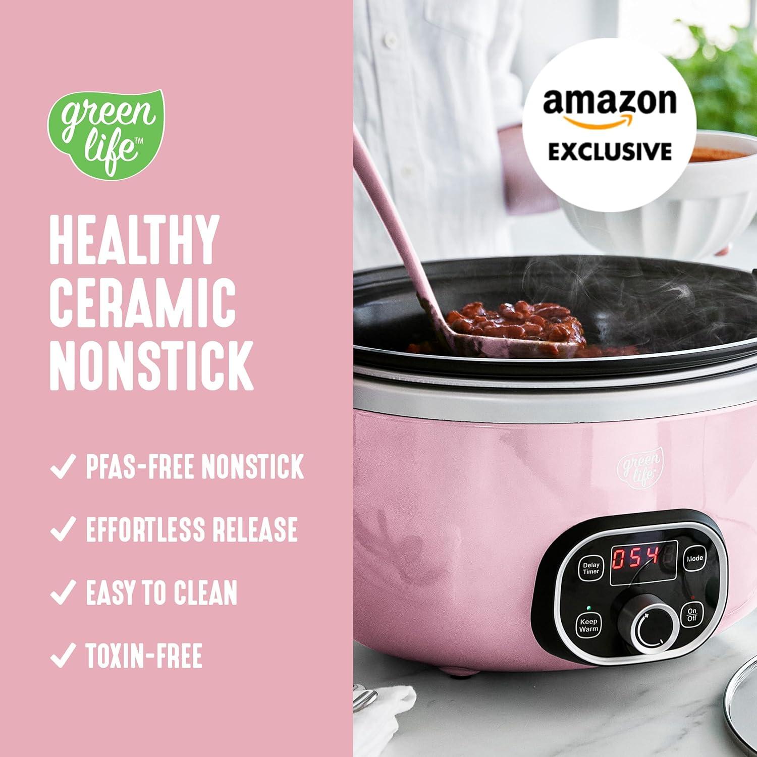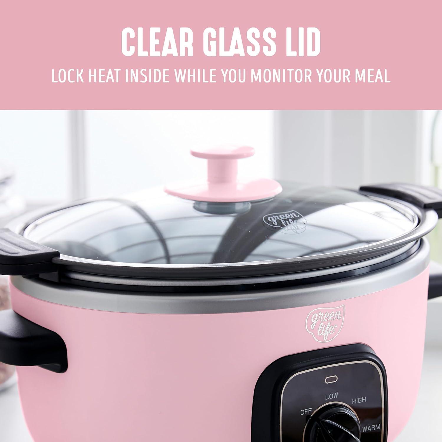 GreenLife 8QT Slow Cooker, Non-Toxic PFAS-Free Ceramic Nonstick Removable Interior Bowl, Programmable, Family Friendly, Keep Warm, Stovetop & Oven Safe, Dishwasher Safe Crock, Timer, Glass Lid, Black(Pink)