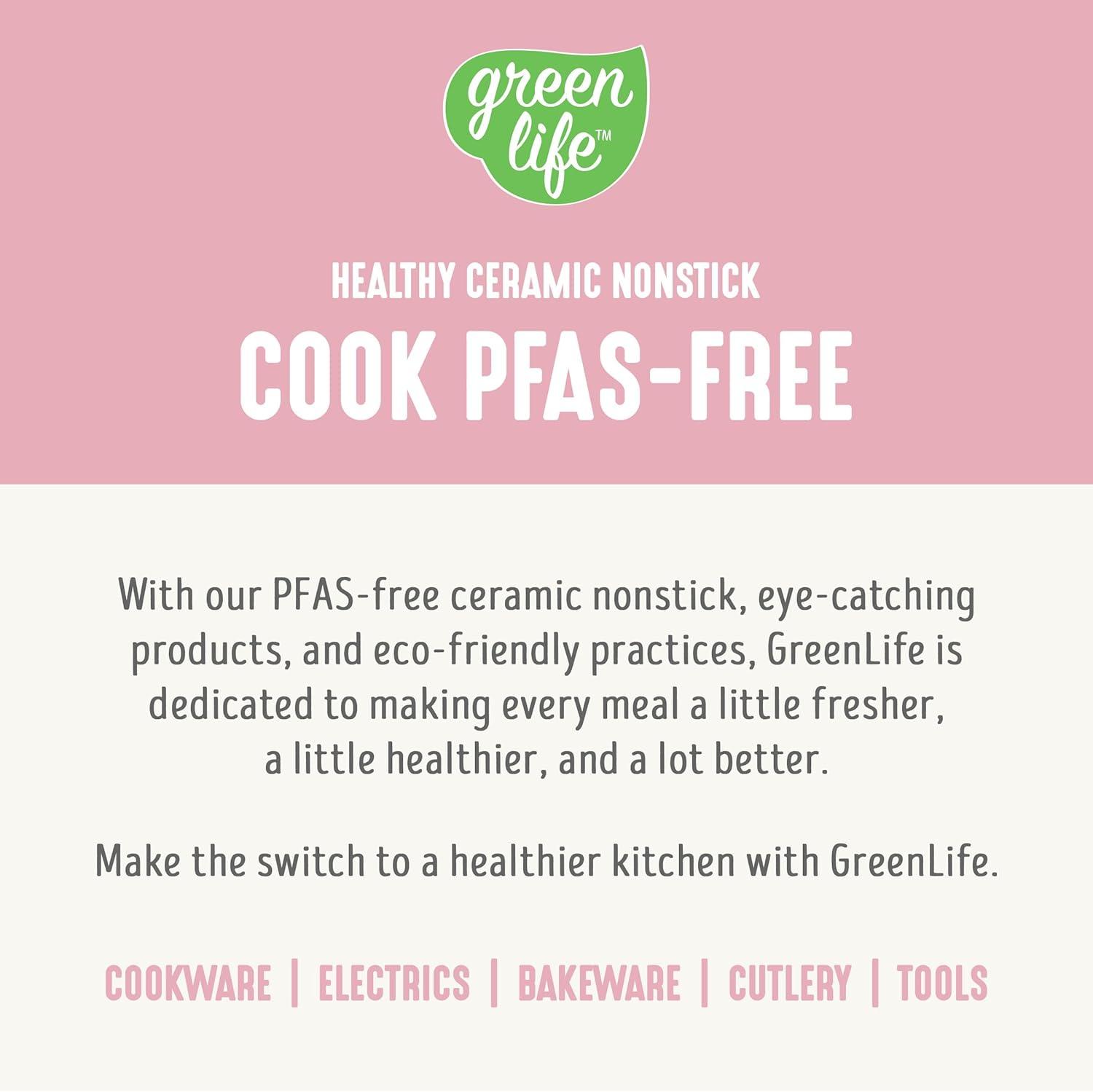 TOXIN-FREE CERAMIC NONSTICK INTERIOR: GreenLife’s PFAS-free ceramic nonstick coating is derived from sand and delivers effortless release with quick cleanup and delivers endless, worry-free meals.