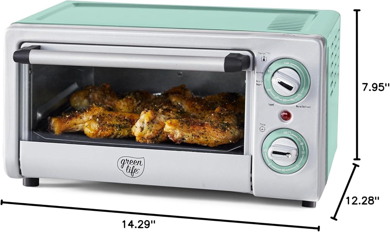 Bake the world a little better with the GreenLife Toaster Oven Bakeware collection. Designed to inspire your inner baker, this set makes everything from sweet to savory dishes a little healthier thanks to the premium nonstick coating, which is free of PFAS, PFOA, lead, and cadmium. The set’s eye-catching bodies are constructed with heavy-duty steel for fast and even heat distribution and extra crispy baking results. All the pans are oven safe up to 450°F. Toaster oven bakeware set includes: a 6-cup muffin pan, rectangular cake pan, baking tray, and cooling rack. Hand wash only.